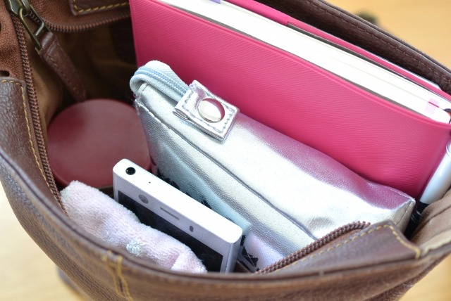 ポーチ内部が前・中・裏の3層構造になっていると、自然と仕分けがしやすく、探し物のストレスも減らせます。 一方で、ガジェット類や化粧ポーチなどの大きめのアイテムは、サブバッグに入れておくと安心です。
